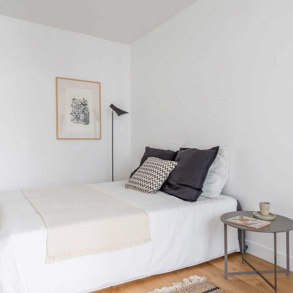 Situé au 1er étage sans ascenseur, l’appartement traversant et très calme s’ouvre sur un large séjour de 28,5 m2 qui donne accès d’un côté à la cuisine et à une courette intérieure à usage exclusif de 5 m2 supplémentaires, et de l’autre à une belle chambre.